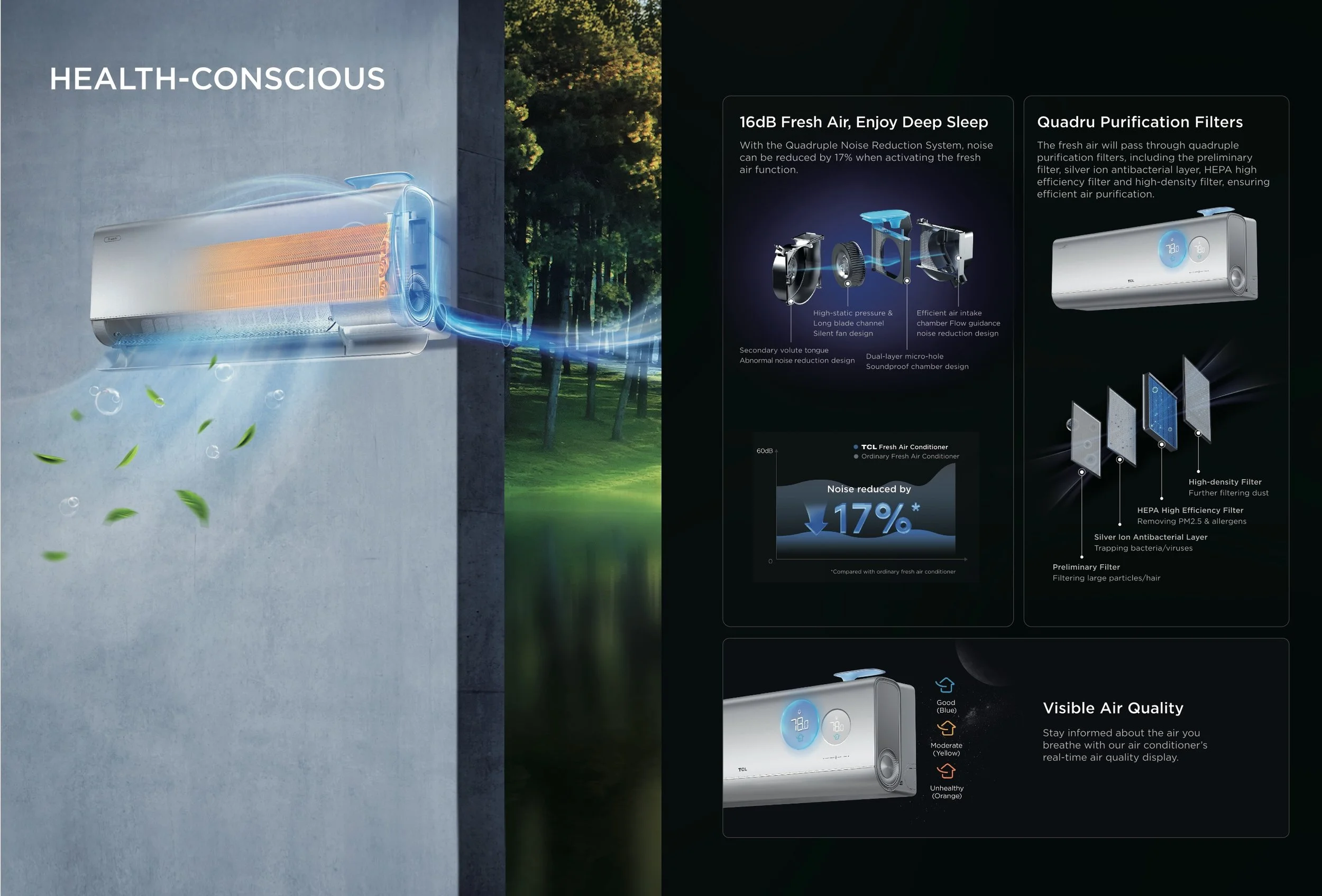 TCL’s Patented FreshIN+ design brings in fresh outdoor air and monitors intake levels for a cleaner, more comfortable indoor environment.